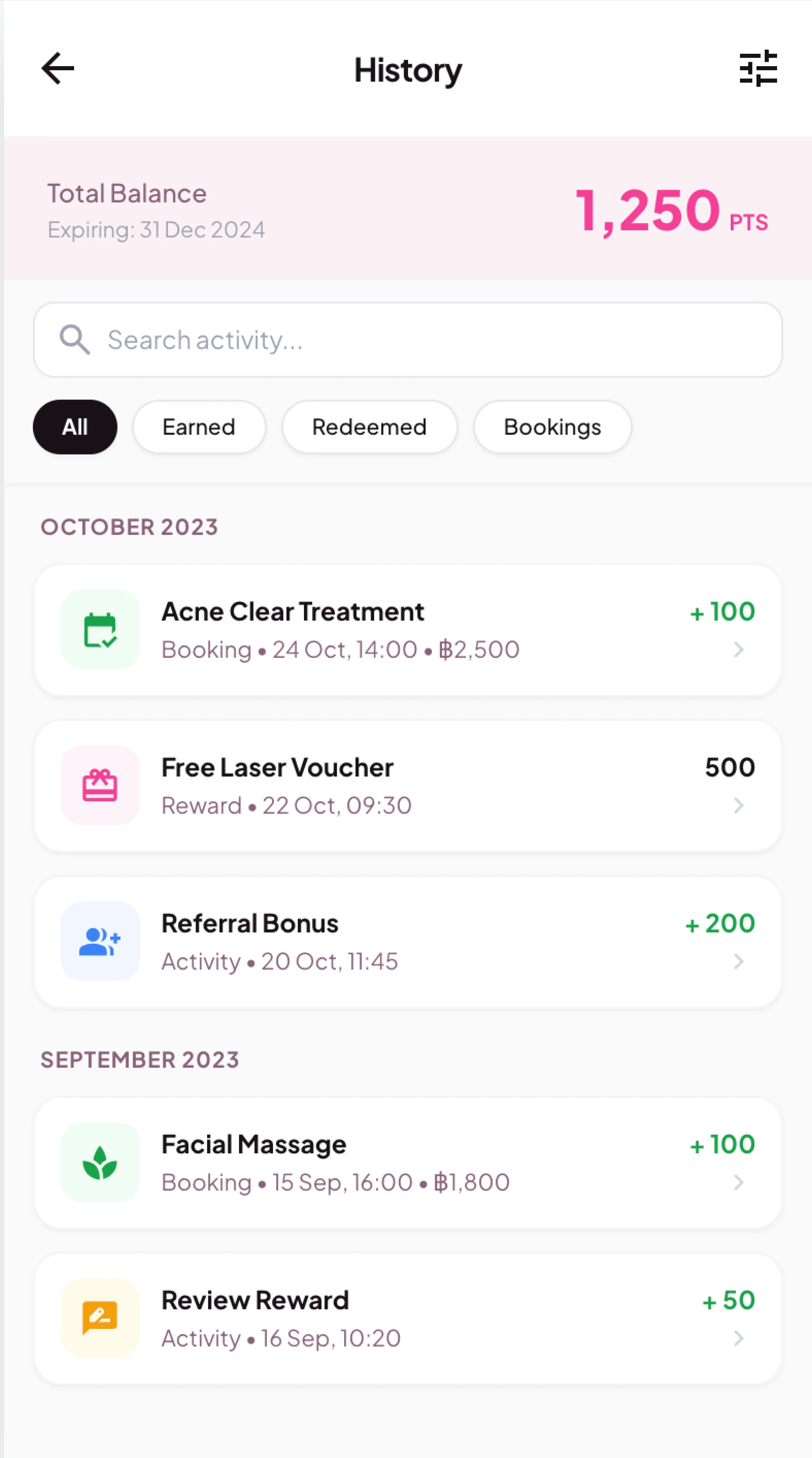 แพลตฟอร์ม Booking & Loyalty ครบวงจร สำหรับคลินิกความงาม รวมระบบจองบริการ (เลือกหมอ เลือกวันเวลา ชำระเงินออนไลน์) พร้อม Loyalty Programแบบ Tier-based ที่สะสมแต้มทุกครั้งที่ใช้บริการ แลกของรางวัลได้ทันที รองรับระบบ Referral ชวนเพื่อนรับแต้มพิเศษ